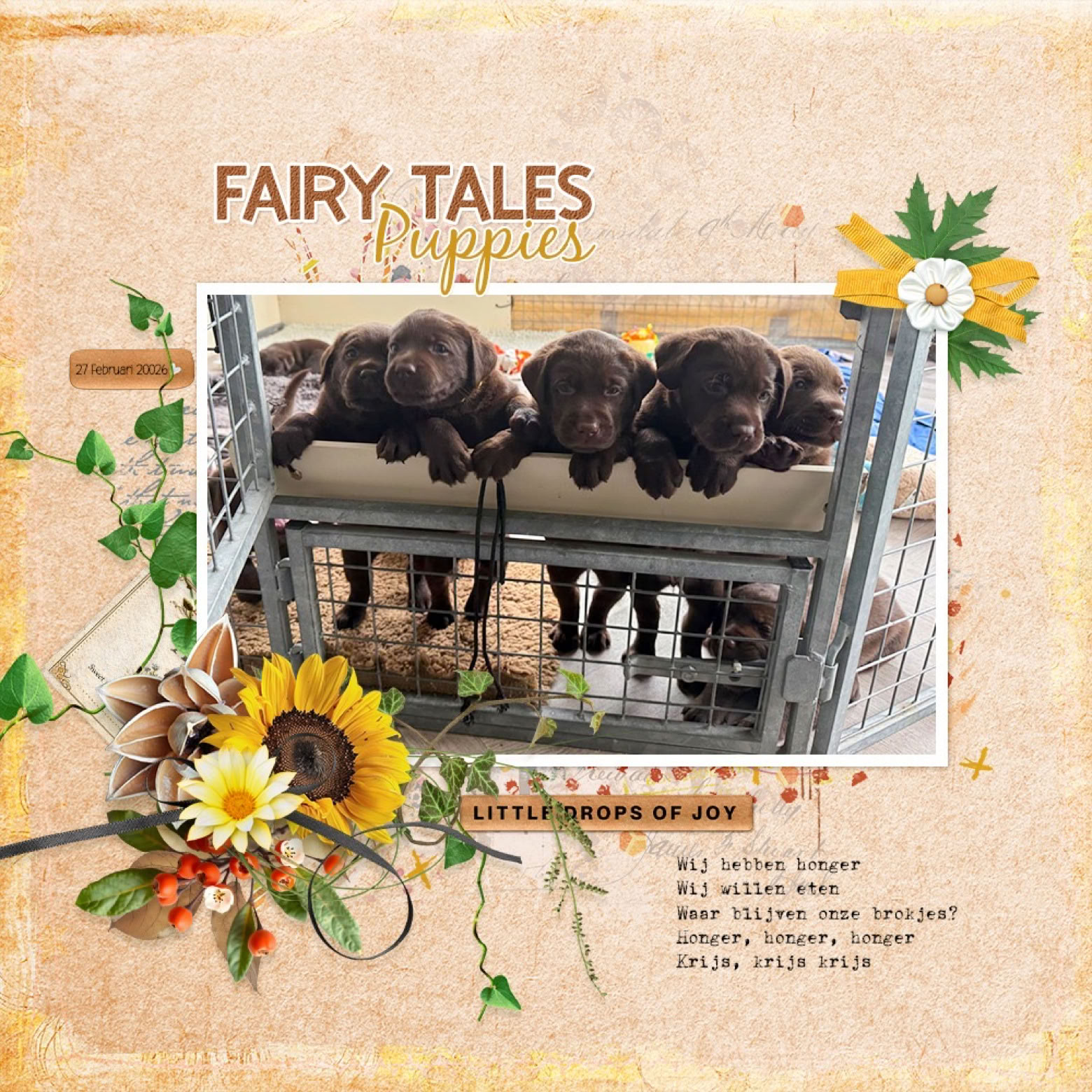 Op 20 januari is ons laatste nestje Fairytales geboren. Dit zijn de laatste pupjes van de Smacklabs die hier geboren werden. Nog steeds bijzonder vanaf het eerste pupje tot aan het laatste. Voor mij zijn en waren ze allemaal speciaal en hou ik van allemaal net zoveel. Mijn hart is niet leeg maar gevuld met liefde door deze pups. Het was een eer om jullie op te vangen in mijn handen en om jullie daarna los te laten om in de wijde wereld te stappen. Als het aan mij lag zou ik nog niet stoppen maar helaas ik moet omdat mijn lijf het niet meer kan. Elk pupje verdient het om met alle zorg begeleid te worden om de wereld aan te kunnen . Iets wat je niet zomaar doet. Na de geboorte worden ze verzorgd door de moeder maar ook door ons, we willen dat hun bedje schoon maar ook het eten en niet in de laatste plaats de socialisatie. Ook zal ik de pupkopers missen, zonder jullie zou ik geen pupjes kunnen hebben, mijn huis is te klein om al deze wondertjes te herbergen Mijn liefde en mijn hart blijven groot genoeg. Ook de fairytails krijgen een. mooie start en veel liefde mee en ook deze zal ik uitzwaaien met de tranen in mijn ogen…Dus lieve mensen ik hoop dat jullie allemaal met mij zullen genieten van de bijzondere tijd. Genieten van de webcam, de foto’s mijn verhalen op Facebook en diegenen die bevoorrecht zijn om een pup van ons in hun wereld te mogen verwelkomen, genieten des te meer want hierna is het hoofdstuk gesloten. En net als alle pupjes hebben we natuurljk een thema met bijbehorende namen.